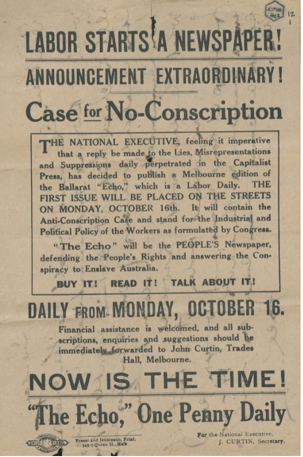 Flyer advertising anti-conscription newspaper "The Echo" October 1916. Photo: John Curtain Prime Ministerial Library