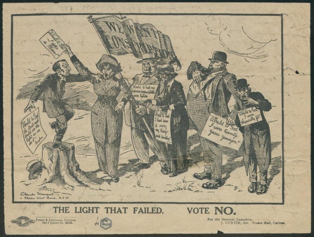 When the Great War began in1914, many Australians volunteered to enlist with the Australian Imperial Force. However, by 1916, the death toll was high, the war had no end in sight, and there were no longer enough volunteers enlisting. Labor Prime Minister Billy Hughes attempted to gain a mandate to conscript young Australian men to fight, despite the opposition of his own party, and the conscription referendums (more correctly, plebiscites) in 1916 and 1917 were key events in Australia’s (more correctly, plebiscites) in 1916 and 1917 were key events in Australia’s political history. The heated debate about conscription during the referendums divided not just the Labor Party but Australia as a whole and tested our democracy, especially the nation’s commitment to freedom of speech.